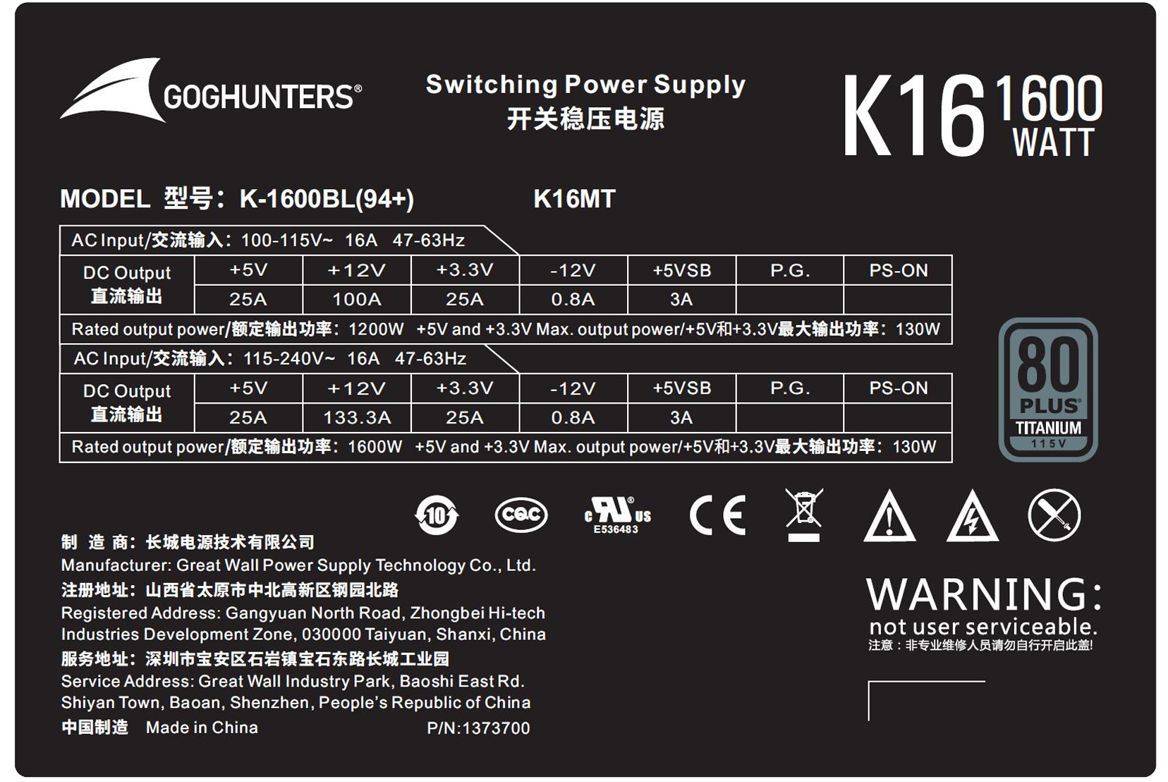 额定1600W F16白金全模电源(ATX3.1标准/PEIe5.1接口/全电压/单路12V/自动启停)